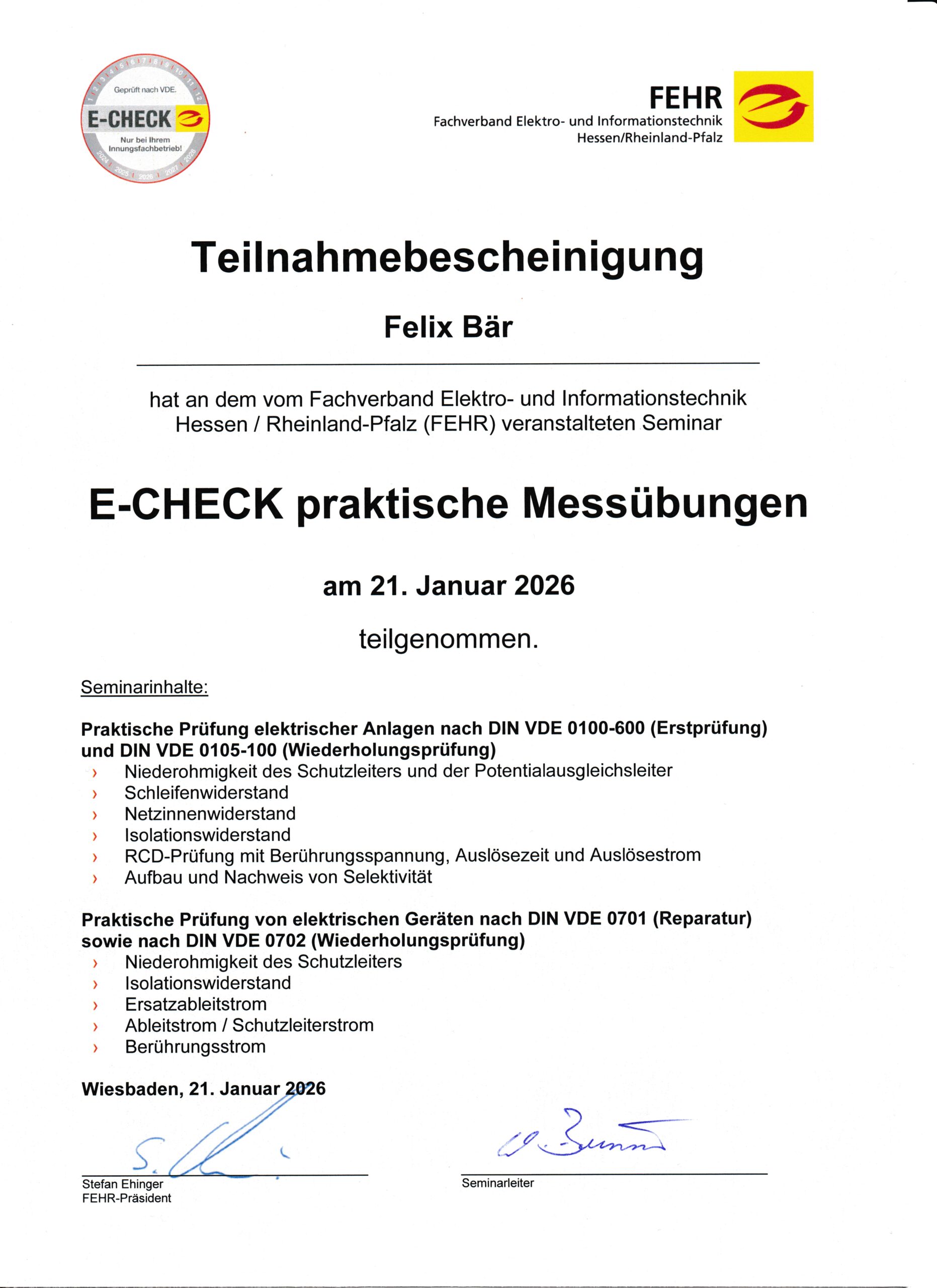Wir sind ein E-Check zertifizierter Fachbetrieb